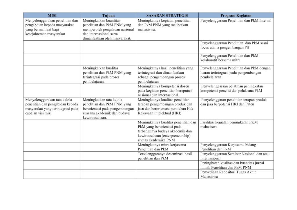 - Menyelenggarakan tata kelola penelitian dan pengabidan kepada masyarakat yang terintegrasi pada capaian visi misi
